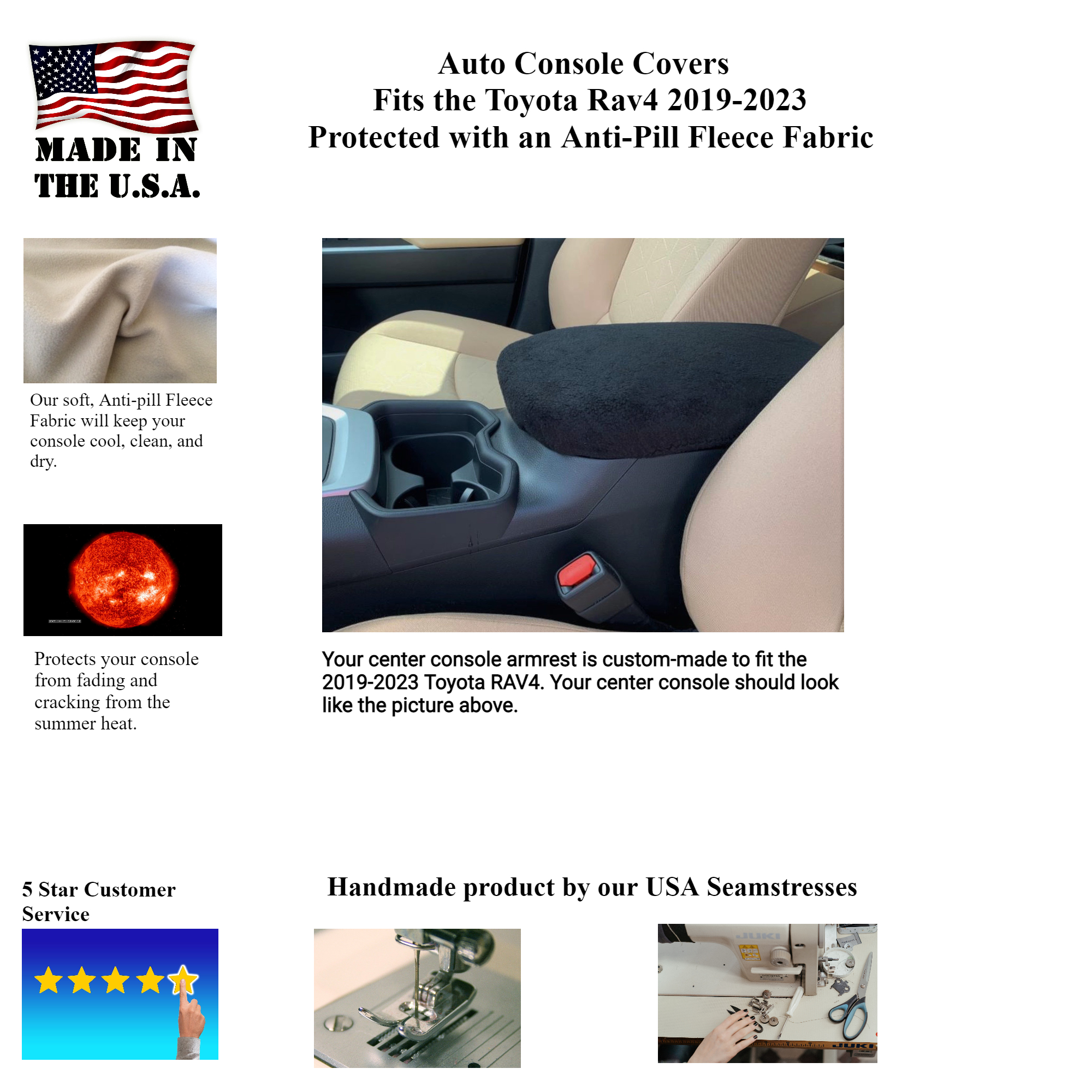 This center console cover is made with your choice of a high-quality anti-pill fleece fabric, which is a soft machine washable fabric that is offered in many different colors and unique patterns. Auto Console Covers protects your vehicle from everyday wear and tear while providing added comfort and style to your vehicle’s interior. Our cover is designed to fit your Toyota RAV4 2019, 2020, 2021, 2022, 2023, 2024, and 2025.
