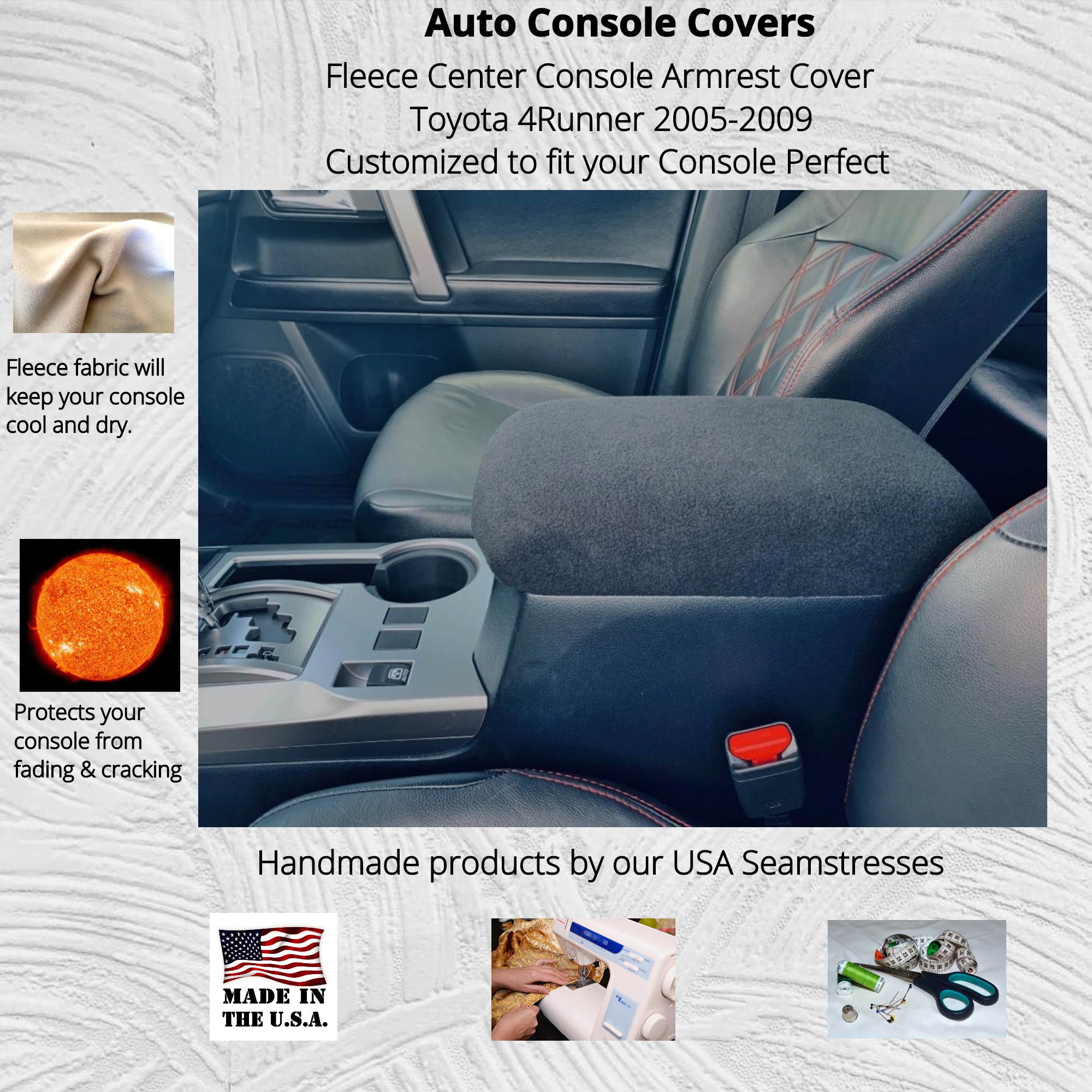 This center console cover is made with your choice of a high quality anti-pil fleece fabric, which is a soft machine washable fabric that is offered in many different colors and unique patterns. Auto Console Covers protects your vehicle from everyday wear and tear while providing added comfort and style to your vehicle’s interior. Our cover is specifically designed to fit your Toyota 4Runner 2005, 2006, 2007, 2008, 2009.